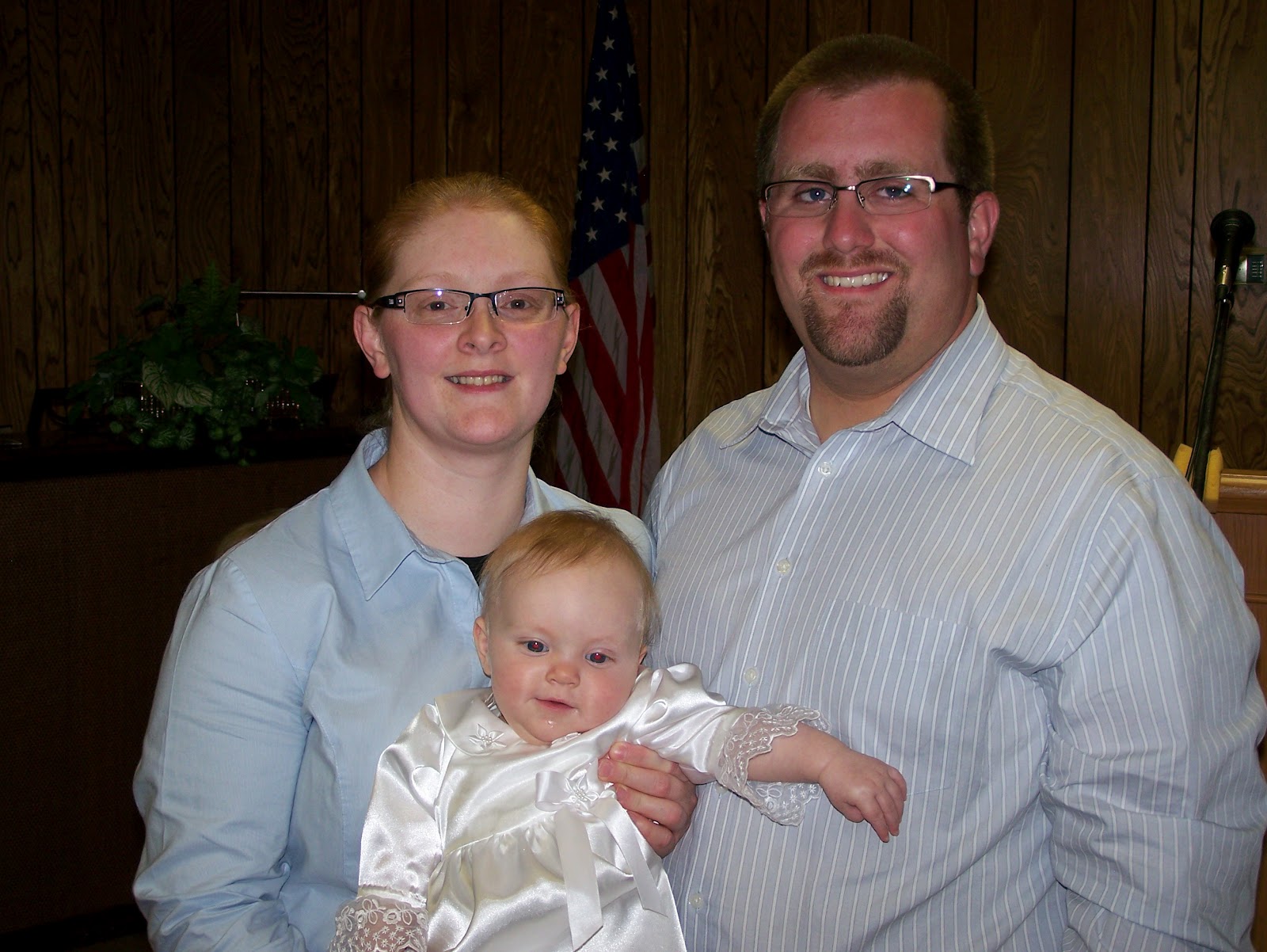 | Charissa was dedicated to the Lord on Wednesday evening, May 16th. She went to sleep during the earlier part of the service, so she "behaved" very well for the dedication. |